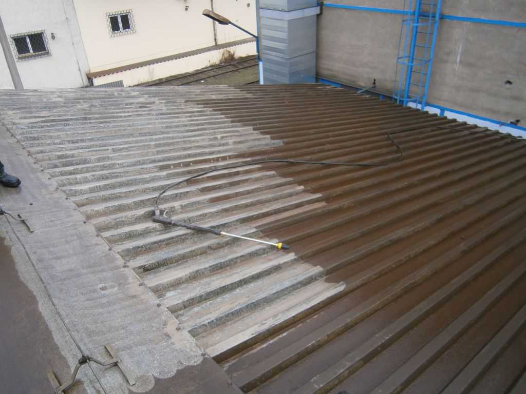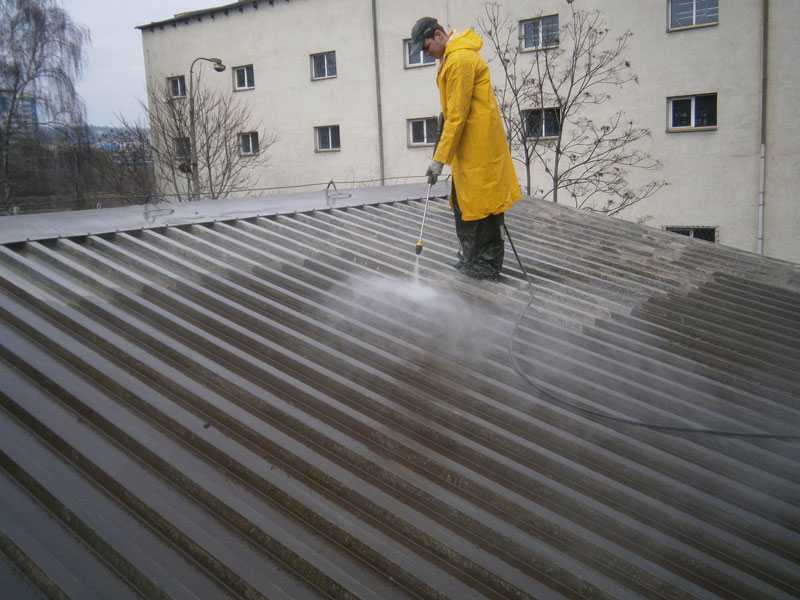 Als Vorbehandlung der Blechdachoberflächen vor dem Lackieren verwenden wir überwiegend Hochdruckwasserstrahlen mit 500 bar und spezielle hocheffiziente rotierende Düsen. Bei diesem Prozess entfernen wir alte Farbreste und Korrosion an beschädigten Plätzen. Nur zur Flächenreinigung benutzen wir Maschinen mit einem Druck von 300 bar, wobei Reinigungschemie eingesetzt werden kann. Wenn wir eine große Reinigungsleistung brauchen, setzen wir extreme Hochdruckdüsen bei 1000 bar ein.